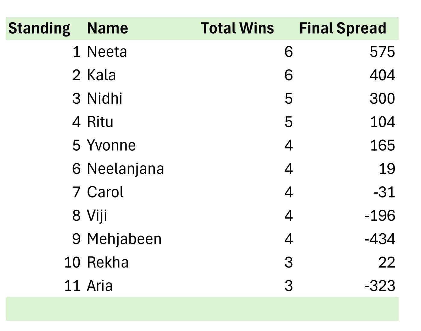 Tournament placings by wins and margins.
