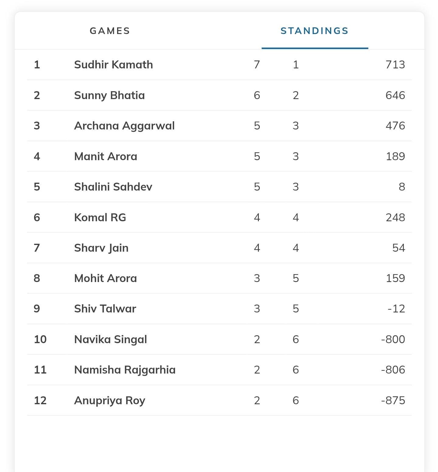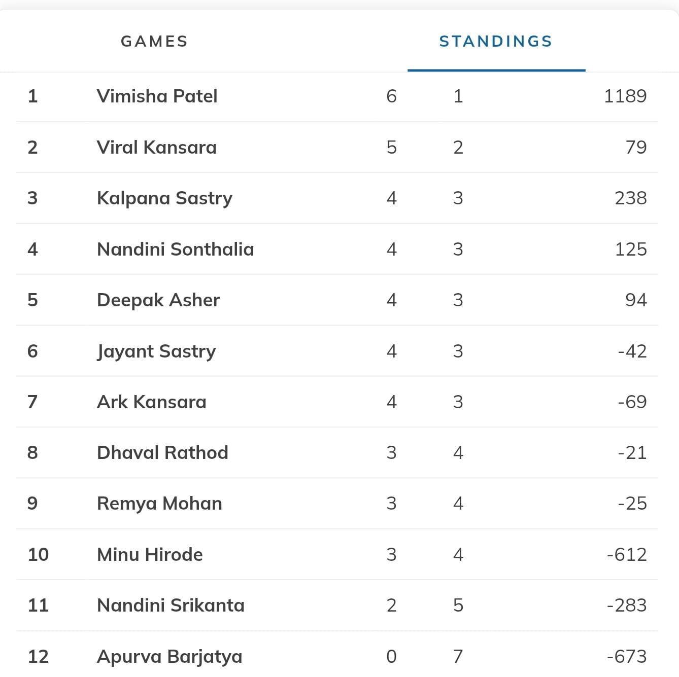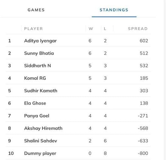 |DEL Anupriya Roy | 201 | 46 | 2.0 | 500 | +————————–+———–+———+- 7 games -+—————-+ |xDEL Shiv Talwar | 135 135 | 21 21 | 3.2 3.0 | 621 -4 617 | | DEL Komal RG | 55 66 | 7 8 | 5.8 3.0 | 1106 -56 1050 | +————————–+———–+———+- 4 games -+—————-+ |DEL Navika Singal | 202 | 47 | 0.0 | 500 |
